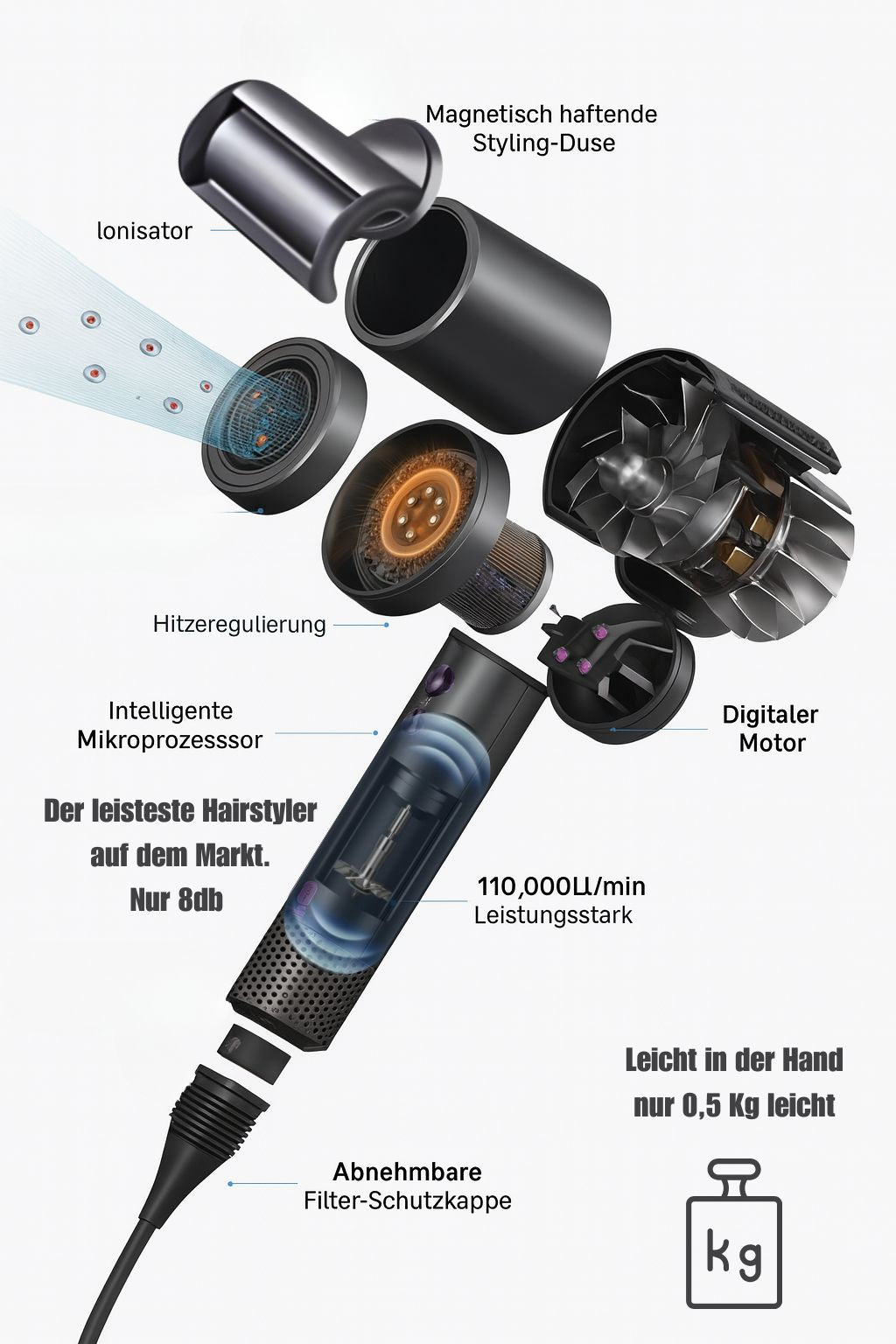 Der AirPro liefert mit seinem digitalen Hochfrequenzmotor bis zu 1600 W Leistung, erreicht schnell optimale Trocknung – und bleibt gleichzeitig leicht in der Hand. Dank optimierter Luftführung und leisem Gehäuse liegt das Gewicht spürbar unter vergleichbaren Geräten. So stylst du ohne Ermüdung.